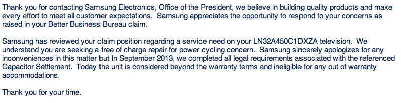 I have a flat screen television purchase a few years ago that has been cycling itself on and off for over a year. I recently found out through an online search that it was manufactured with a defective capacitor. Because of this known defect, I contacted samsung and requested a free repair. I have never requested a free repair on any product outside of warranty, but because this was a known defect I felt that they should stand behind it. I called and was told that they were offering free repairs for about a year but the program has expired. I appealed this through the better business bureau and a letter from the office of the president at samsung tells me everything I need to know about this company. The letter states "in september 2017, we completed all legal requirements associated with the referenced capacitor settlement. " simply stated, they were sued over the defective part and once they met their legal requirements, everyone can go screw themselves. To hell with what is morally right, to stand behind a "defective/inferior" part - their words, not mine.