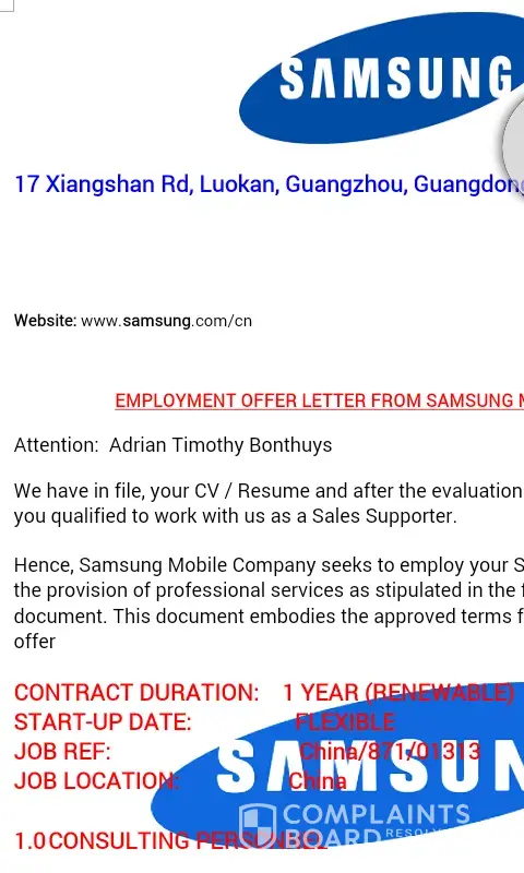 Good day. I applied for a sales person position from China. Ad was on Facebook. The attached letter I received as my employment contract.