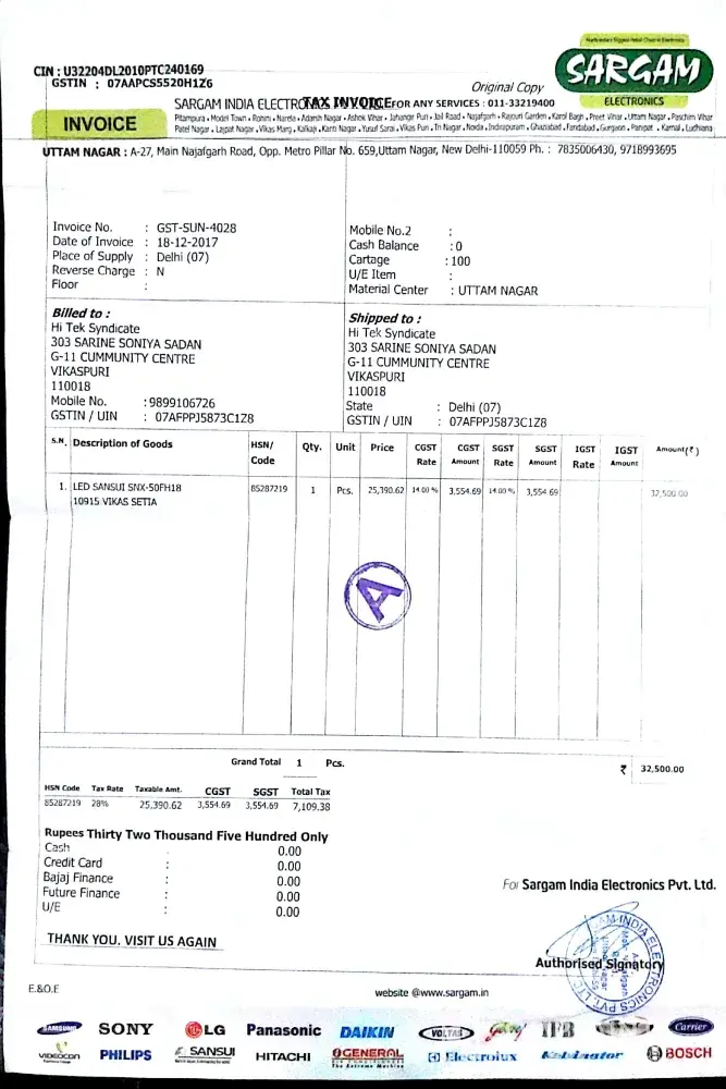 I have purchased your SANSUI 32Hd LCD TV-sft 32 hbm having serial No.[protected] on 10-12-2010 from M/s.Reliance Digital Retail Limited, Visakhapatnbam, Andhra Pradesh.