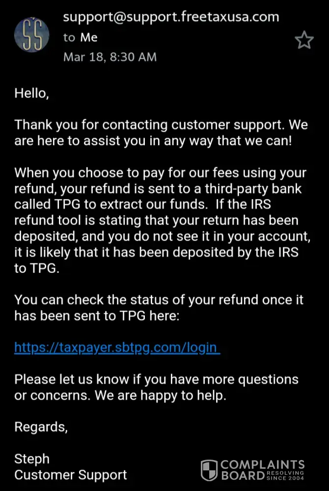 This company could care less about any customer. They lie, no one ever calls back. I did my taxes through tax slayer they sent my info to sbtpg who received my refund on the 24th of February so I should of had it by the 26th the latest. I called tax slayer they told me I had to call sbtpg who told me a check was mailed first of all I never opted for a mailed check I put my checking information for direct deposit which I was told that I never put in and I was told a check was mailed on the 4th of March the 8th, 10th, 12th 14th and 17th in which I gave up. Since no one is willing to be honest and release my funds to me I have reported this company to BBB the IRS News on Your Side and I contacted an attorney. I am coming after you hard.