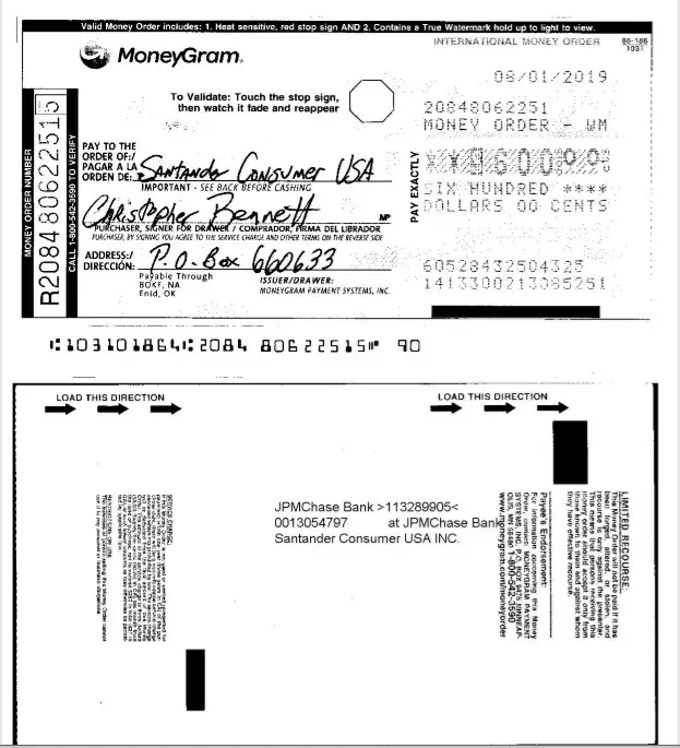 Moneygram charged me $20 to trace this money order payment and at no time did the Customer Service or Collections Departments did their due diligence to investigate, research, or pursuit that payment made. Constant harassing and disrespectful phone calls from the collections department from Santander Consumer showed absolute laziness in their collective indignation on simply not trying to follow up on proof the payment was made. To make this situation worse, some of the Santander Collections clerks threatened to have my car repossessed. As a responsible paying customer, I find this degrading, appalling, and abhorrently disrespectful.