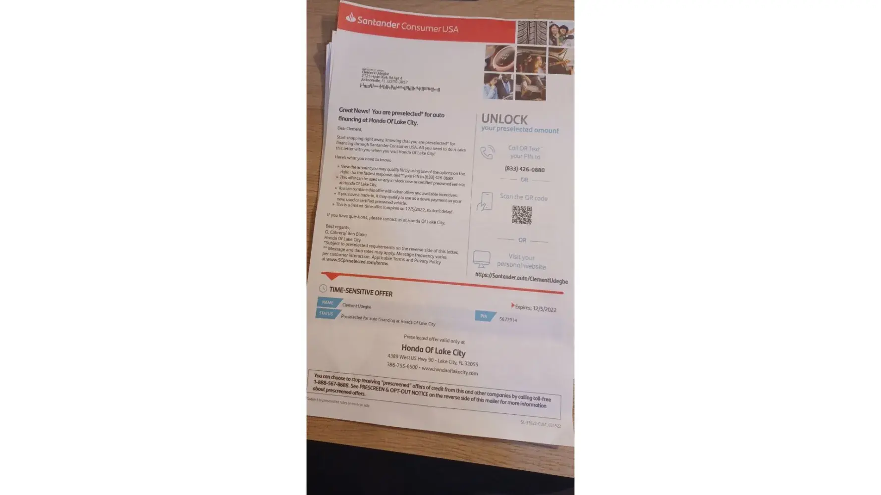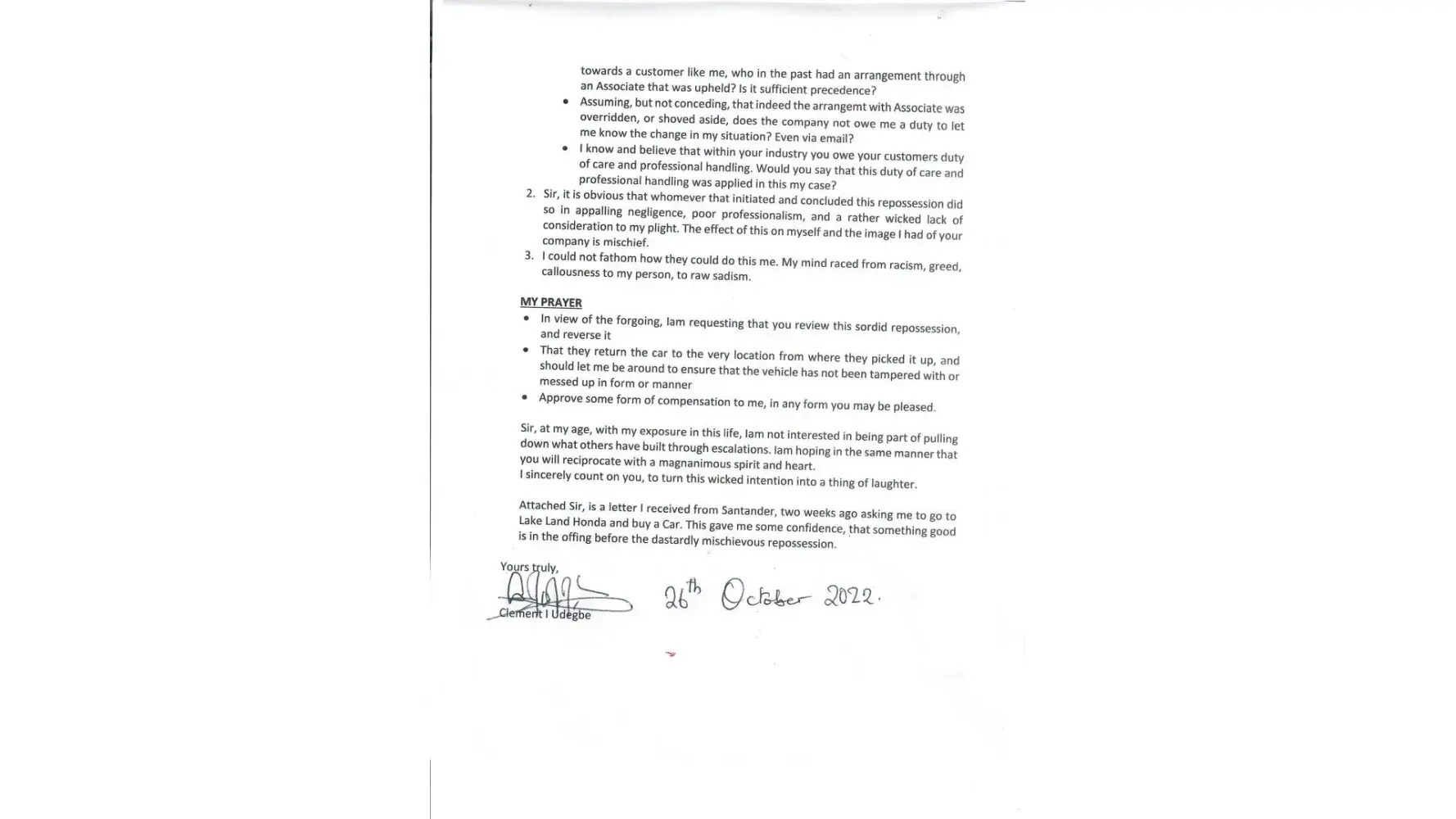 Attached Sir, is a letter I received from Santander, two weeks ago asking me to go to Lake Land Honda and buy a Car. This gave me some confidence, that something good is in the offing before the dastardly mischievous repossession.