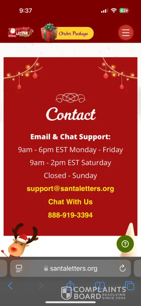 I ordered a package for my daughter and got an email saying it was shipped on December 10th. They said it would take 5-7 days to arrive. The package had a letter from Santa, a copy of the "nice list" with her name, a map of Santa's route, and a certificate for being on the "nice list". I wanted my daughter to read it before Christmas as a surprise. But guess what? It's now December 24th, Christmas Eve, and the package still hasn't come. They didn't give me a USPS tracking number unless I paid extra for 1-3 day shipping. So I can't even track it. I tried reaching out to them on Facebook, but they blocked me from commenting. Then they told me to complain to the ComplaintsBoard.com about USPS, but you can't do that. They haven't said anything about giving me my money back or anything. But I do have emails and screenshots from this company to prove it.
