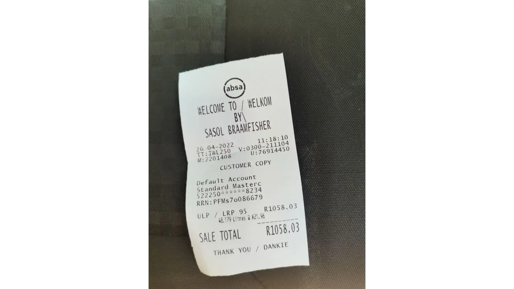When I got to my car, there was fuel spillage on the ground and my charge came to R1058. which it didn't make sense, I questioned it but the petroleum attendant generalised my situation with any other car stating that all cars fill up to R1000 and over.