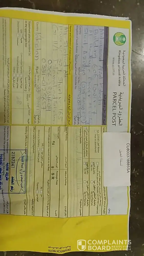 I booked one parcel of 28kg with Saudi post on September 08, 2018 (EH800182628SA) agent Mr. Abid Ali whose nos are as follows: