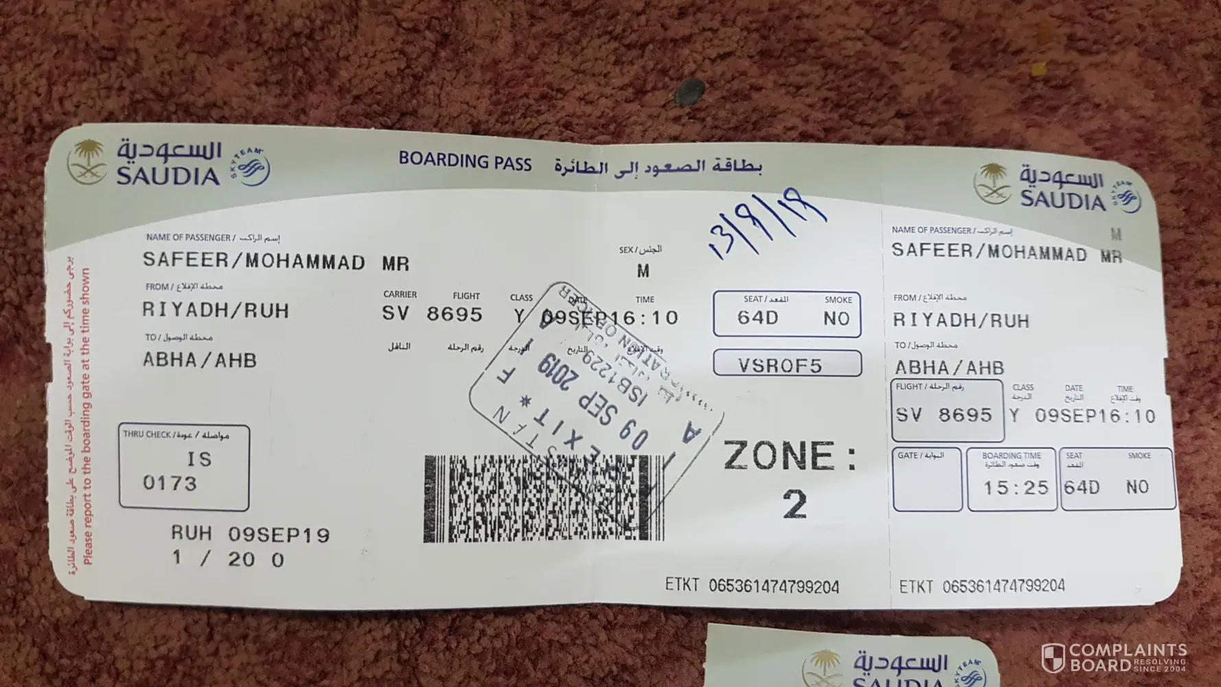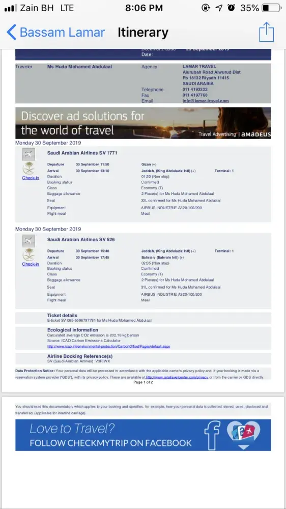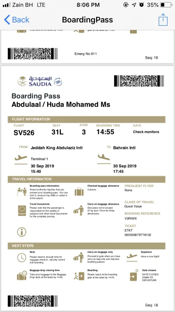 I have a bounding pass with seat selection tkt no t SV 065-[protected] for Ms Huda Mohamed Abdulaal