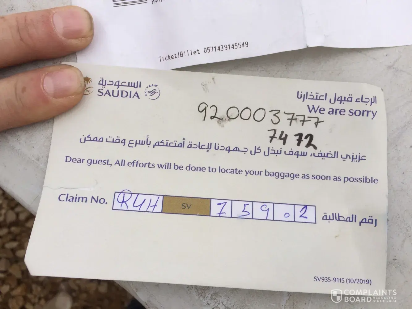 We were issued with a tracking number to call luggage handling reference number is RUH SV 75902. My e-ticket number is [protected] my AF Explorer number is [protected].