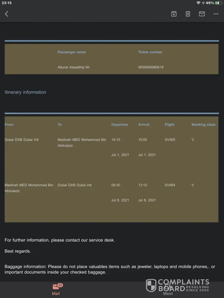 This is Momina Farooq. I have performed Hajj with my husband and I had returned to Islamabad Airport in Pakistan on 16 August 2019. I have not received my lugguage till this day. I have submitted claim request. However it has not been entertained and over a month has passed by. Please respond to my immediate email at [protected]@hotmail.com. After one week time I will proceed to Law Court in Pakistan against the Saudi Airline. I am looking forward to your reply soon.