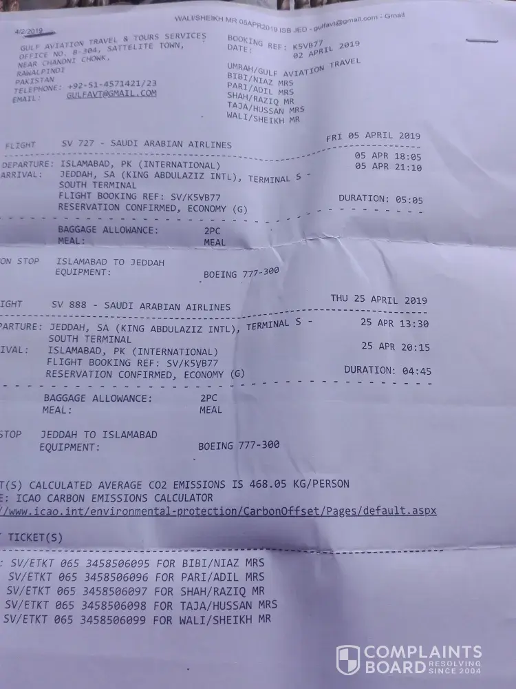 Me & my wife went to makkah through Saudia Airline On 05 April 2019, having the return ticket of 25 April, 2019, my wife died on 21 April and burried there in makkah. Gulf travel Rawalpindi sent all my documents for refund of ticket or any compensation to Saudi Airline main office Islamabad, but no one gave me any response. Plz inform me what I can do. I can show all documents, pla reply must as soon as possible. Thanks [protected], [protected].email [protected]@yahoo.com