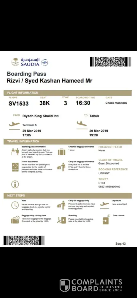 My name is Muhammad Akram living in Sargodha (Pakistan). I have booked the ticket to Travel Saudi Arabia Via Riyadh on 12th April 2019. My booking Reference is R5EMWN. We were five persons named as