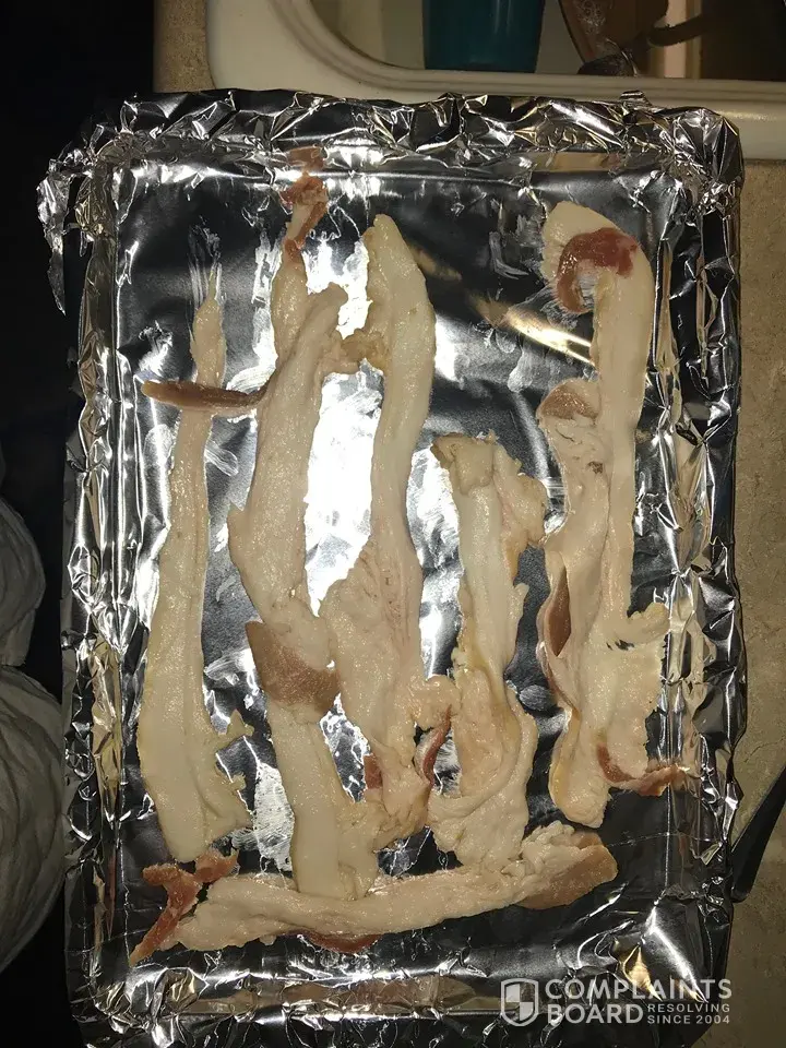 The package of bacon was all fat. Just about the only part that was edible meat was right under the package window of a couple slices and at the very tips of a couple others, there was hardly bit of meat anywhere else. I don't want to complain to the store, it's not their fault, but I won't be buying bacon there again. I thought $3.49 was a good deal, but it was a complete waste of money.