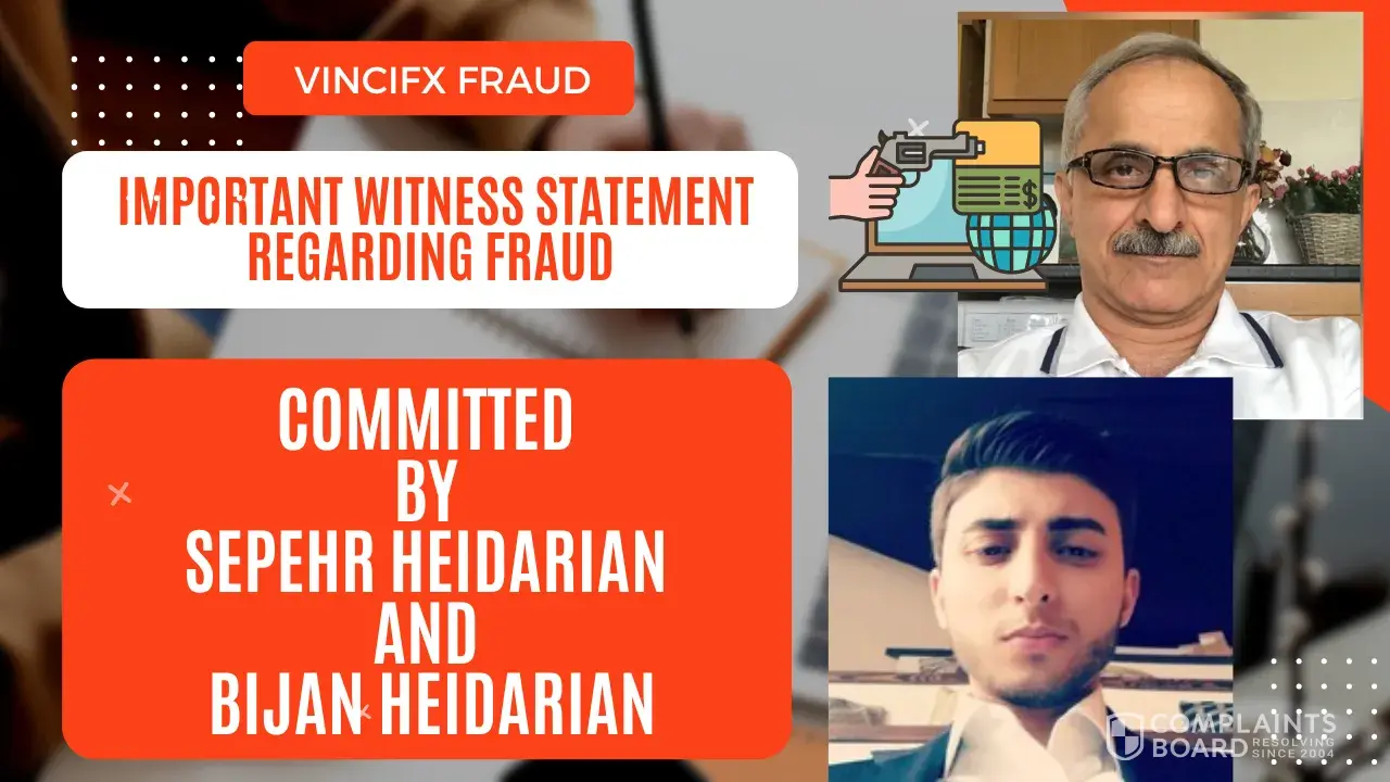 I am writing this formal complaint to bring to your attention the fraudulent activities conducted by Sepehr Heidarian and Bijan Heidarian, which have left me and many others as victims of their deceitful practices. It is with great concern and urgency that I share this witness statement to shed light on the Forex fraud committed by the individual...
