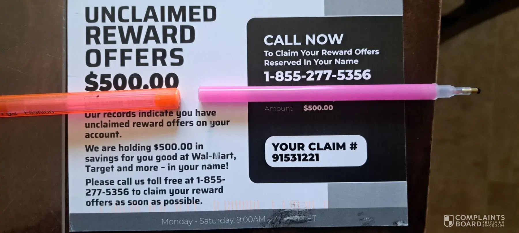 I received something in the mail stating I had unclaimed offers with a value of $500.00 "good at walmart, target, and more" along with a claim number and a 1-877 number. When I called I was asked to give them the "claim number" and when I did they confirmed my name.. they then said all I had to do to receive the $500 gift card was pay a "shipping" fee in...
