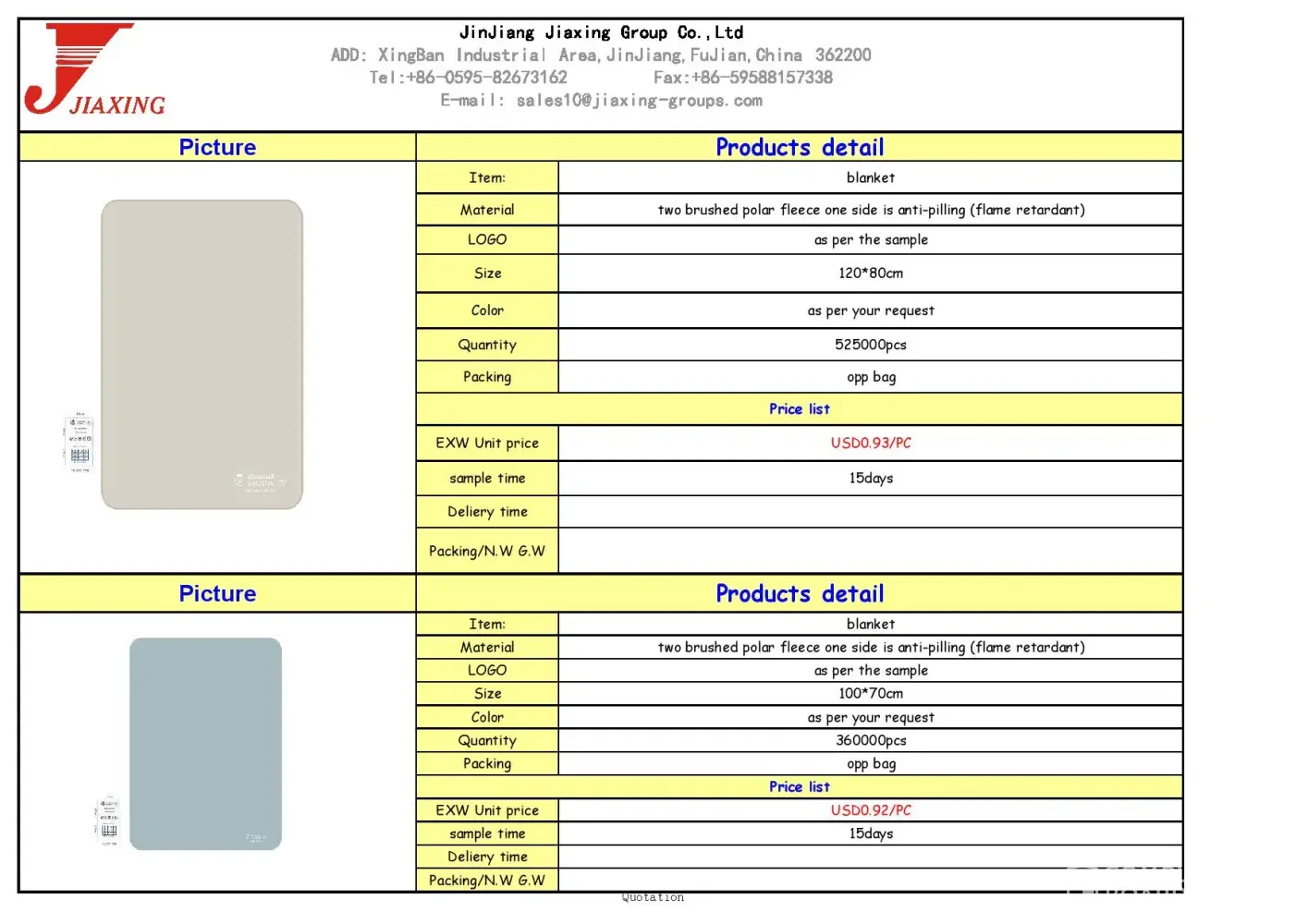 JinJiang Jiaxing Group Co., Limited, is really professional… in scamming people. Lily, her boss named Roy and her manager Holly were very professional in tricking us. At first, We had a quotation from this factory for producing blankets of two different size, we agreed on a FOB unit price for 0.93 $ and 0.92 $. When receiving the first quotation...