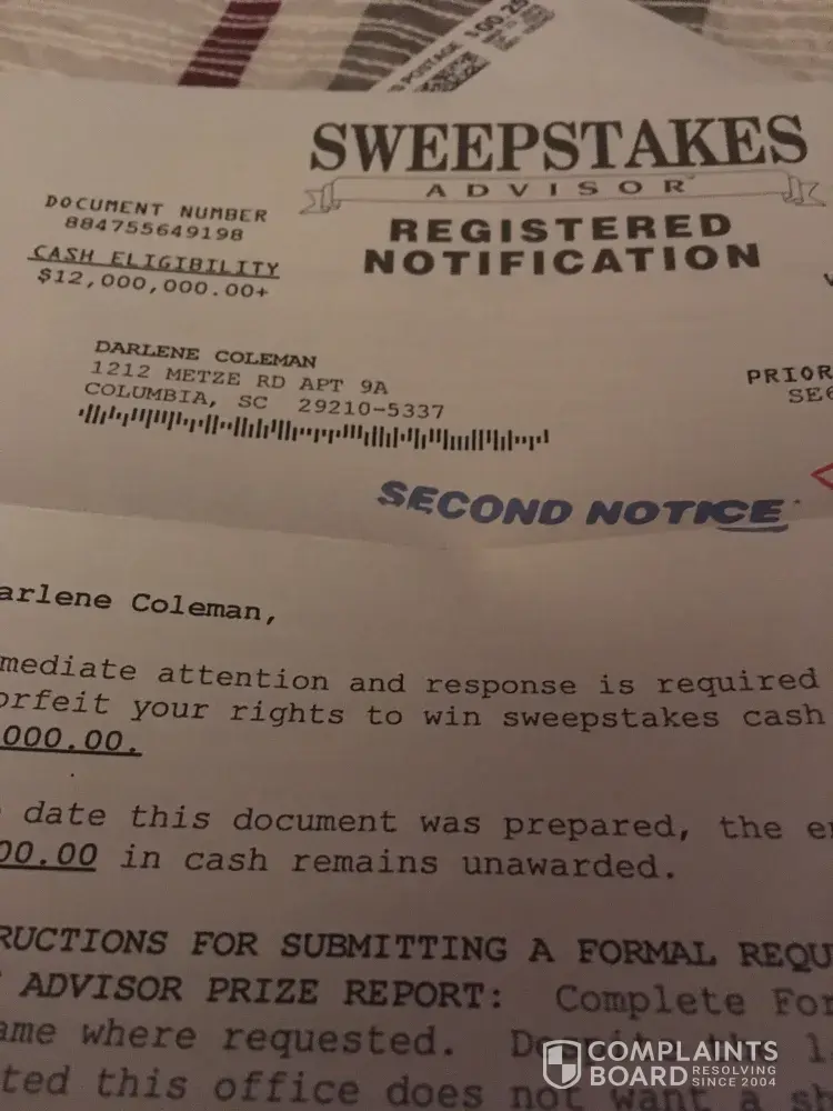 Read full complaint and 16 commentsSweepstakes Advisor Prize Report - letter