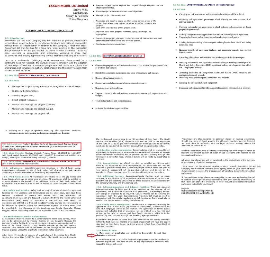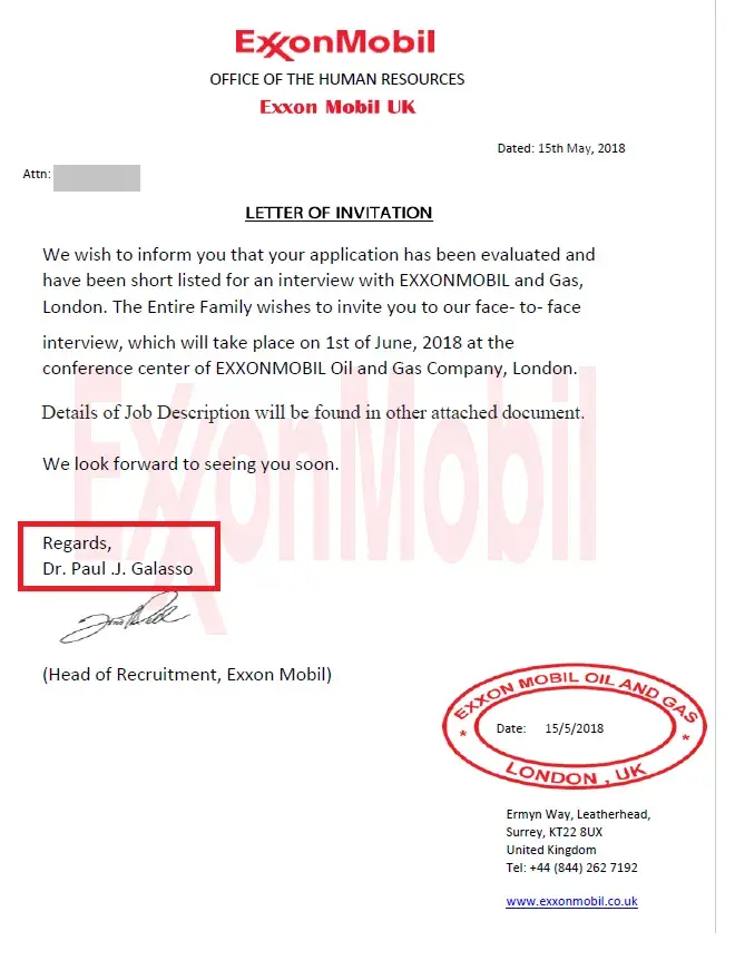 Hi, I'd like to report a scam for a Job Offer that I received today via e-mail. I'll give as many details as possible. Email coming from: [protected]@atsc-d.com (i checked the domain, it is a false one, with no content on their website. Also, nothing relates to the Exxon Mobile official emails) Subject: Attn: "my name" Body: see screenshot...
