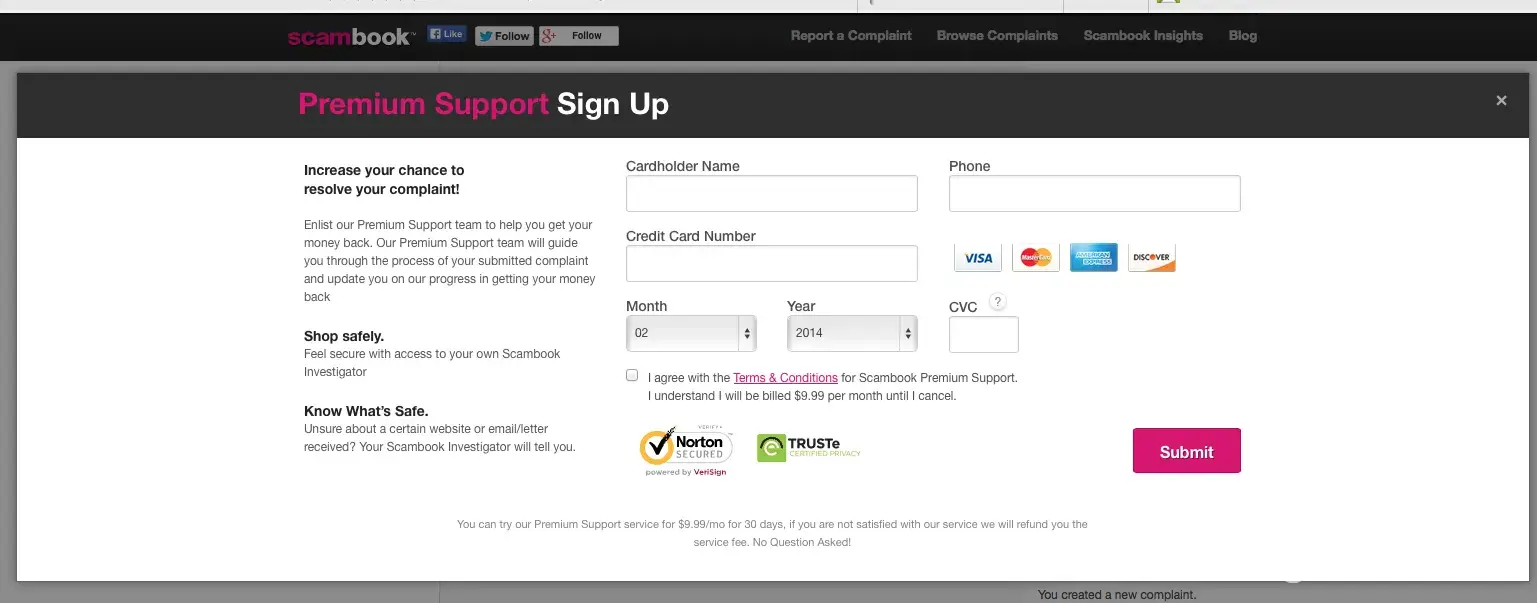 try posting a scam on this website but it never goes thru, then I read down further that to make one report this company wants 9.99 for one complaint or you can get a premium package for so much more $, is scam book a scam too