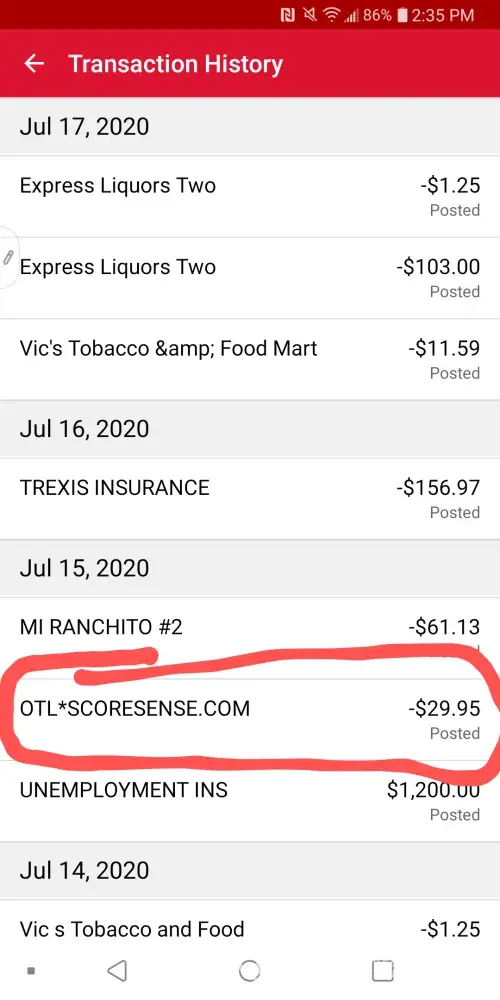 I recently used a service as did my mortgage company to check my credit score. That was ONE TIME over a month ago. Now I see the hit on my checking account each month. CUT & PASTE FROM MY ON-LINE Banking screen — 6/21/2021 OTL*SCORESENSE xxxx-3166 ($29.95)