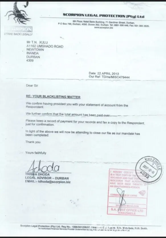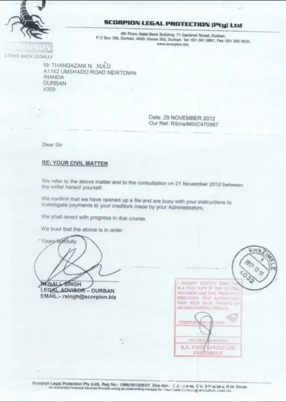 My Ngwenya promised to revert back to me. He never did until in April when I received an sms from scorpion legal protection that the matter has been resolved and the file will be closed.