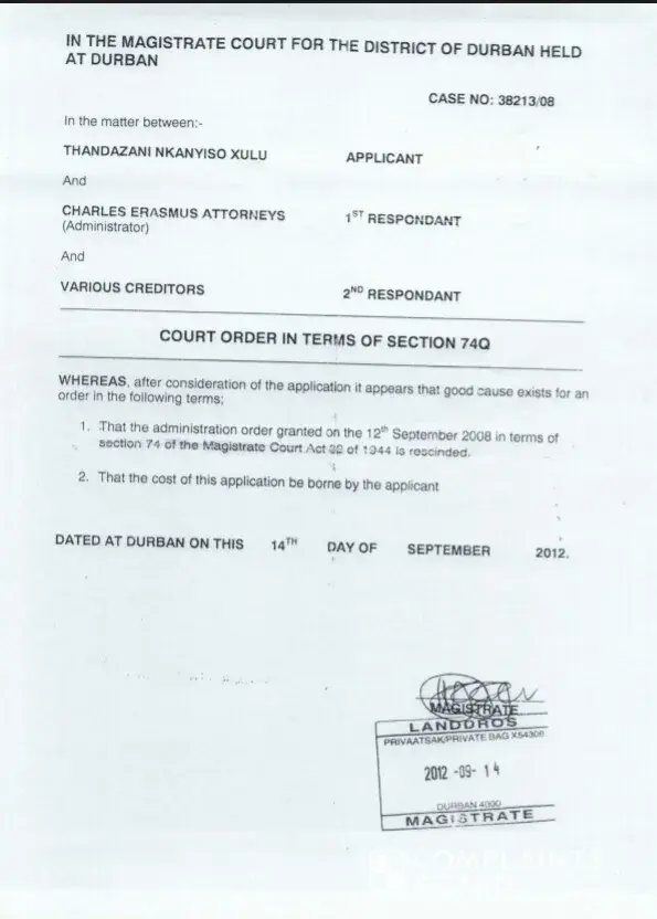 In November 2012 I opened a case at Scorpion Legal Protection in Durban Branch against my former (Administrator) Charles Erasmus Attorneys. And in April 2013 my Legal Advisor Trisha Dhoda (Lied) about giving me my Administration statement of payment that she received from my former Administrator... Please help me to get my Administration statement.