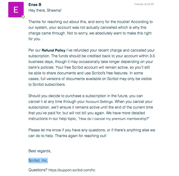 The only reason I didn't say something sooner the charge is the same amount I pay for a movie app and I thought Scribd was the name of the company that handled the charge, but then after I changed where I wanted that charge taken it still kept happening so I contacted my credit card company.