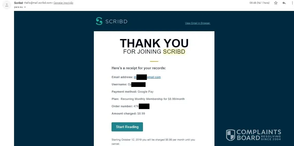 I want to complain regarding the unauthorized charges on my credit card. I have never subscribed in your company, Scribd Inc. You dont have any right to charge me regarding any product. You have charged me since March 2- August 2019 with the amount of US$ 8.99 converted to Philippine peso P485.59, I only found out today when I check my e statements. Please refund all the money that you have charged in my card.