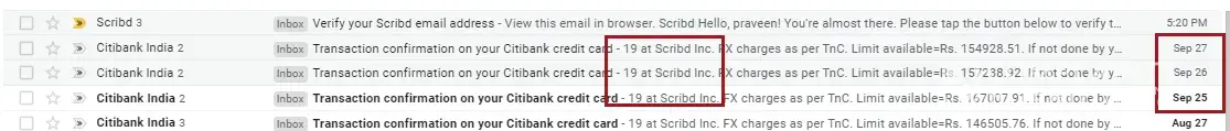Your credit card ***** was used to make a Purchase of USD 8.99 done at Scribd Inc on 31.08.19 at 15:33:49 hrs.
