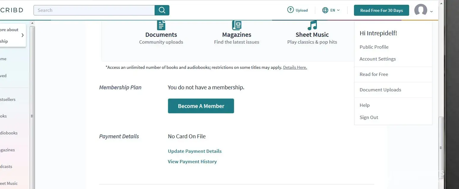 At one time, I did a trial with Scribd but immediately cancelled. I do not like reading books on my computer. I have not used it since.