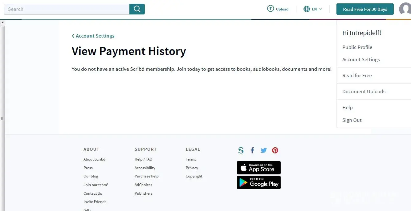 I went into my account at Scribd and it states I do not have a membership, nor is there history of payments, etc. I have screen shots to prove. In fact, when I click on links it takes me to a page to sign up for membership!