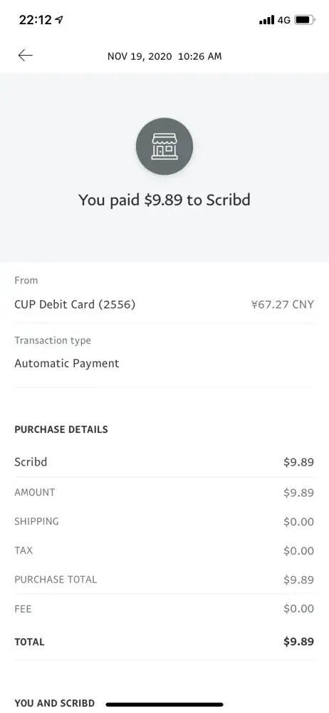 I ended my subscription from Scribd on Sep 20 2020 and haven't use Scribd ever since. But on Nov 19 I was charged another USD 9.89 via PayPal by Scribd. I don't think I was charged in Oct so I believe there's something wrong with your account management. I'm here asking for a refund and be never charged again without subscription. My account on Scribd is [protected]@hotmail.com. Thank you.