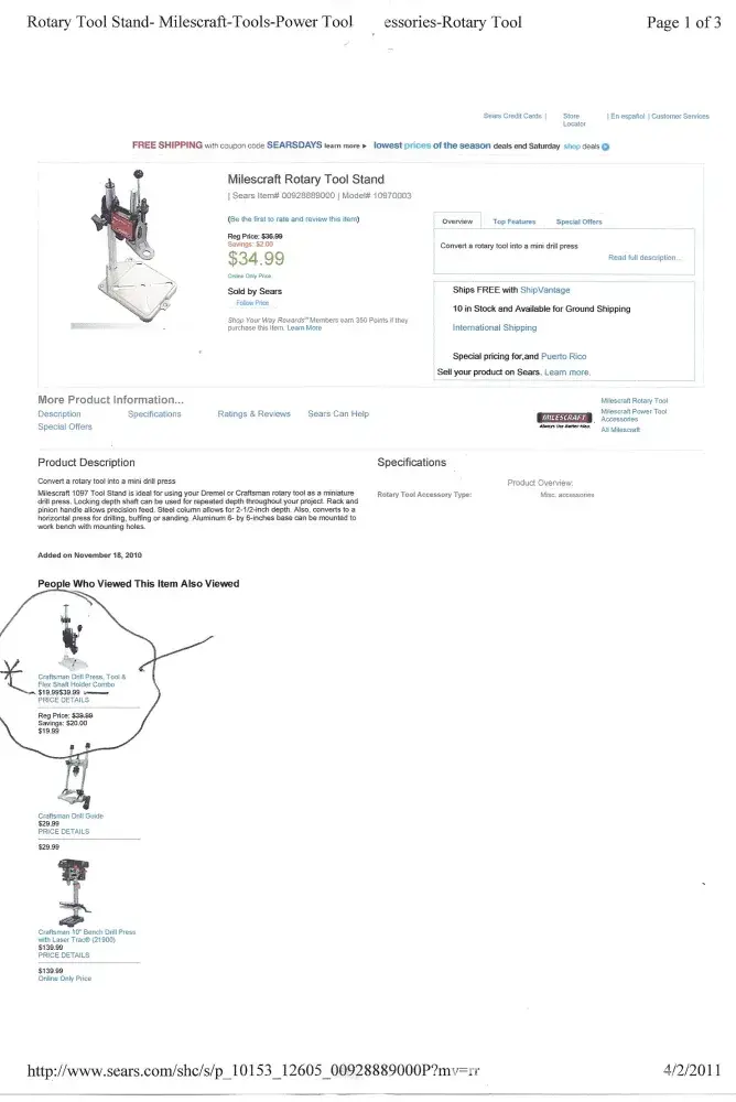I was trying to purchase a drill press stand #[protected], model 220-12. Your internet site listed the price at $39.99 & had a special price icon that I could click onto. I did that and the price came up as $19.99 showing a $20.00 discount. I added the item tio my shopping cart & went to checkout. The price came up with only a much smaller discount. I called the local store in Howell, NJ & they gave me no help. I want to purchase the item at the price of $19.99 as advertised (I have a copy of the ad with that price on it). I hope that Sears will honor the price stated in that ad. If not please advise so I can proceed with my complaint to agencies that follow up on this type of false advertising. Thank you. Raymond Manger [protected]@optimum.net