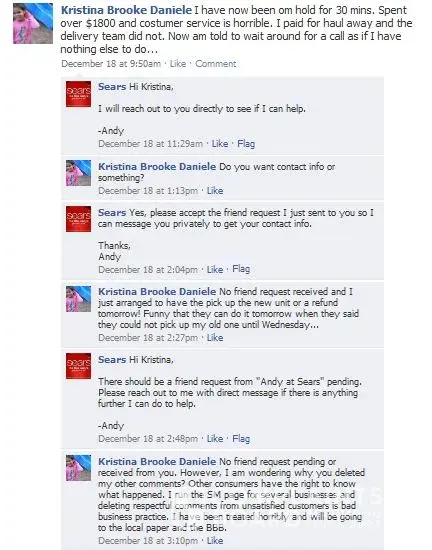 I was tweetingand posting on the Sears Facebook page hoping to get some help and direction. Incidentally, I initially commented 4 times explaining what was happening before anyone responded. My 3 follow-up comments were deleted and I was told they were considered repetitive, spam or pornographic. See my comments in the image below.