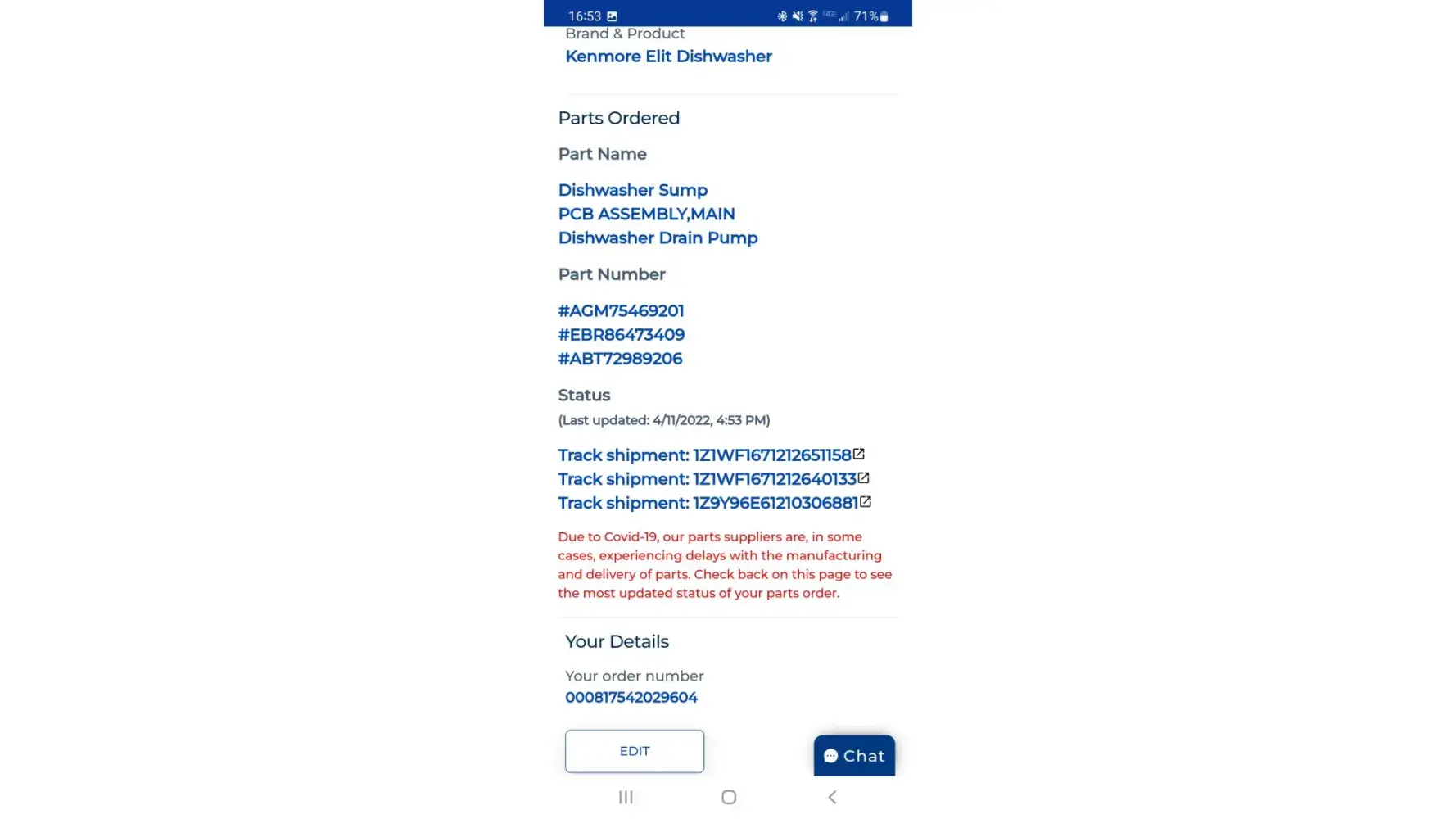 4/20/2022-still have not heard from sears email or phone call. Called their home services number, recording said the board has not shipped yet.