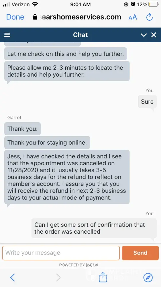 On 11/28 I ordered a part through Sears and cancelled it within 30 minutes of ordering, or so I thought. I spoke to a customer service agent and she confirmed that it was cancelled. Monday I received an email saying my order was received and I was charged for the part. On 11/30 I contacted customer service asking that the part be cancelled. On 12/3 I contacted customer service AGAIN asking when my refund would be processed and I was told that my refund would be escalated and that I would be called by the end of the day. I was not called. I called again on 12/4 and was told that it would take up to two weeks to receive a refund and that there was no way to contact the refund department directly. I then explained that the refund had already been escalated and the response was that I would receive a phone call by the end of today.