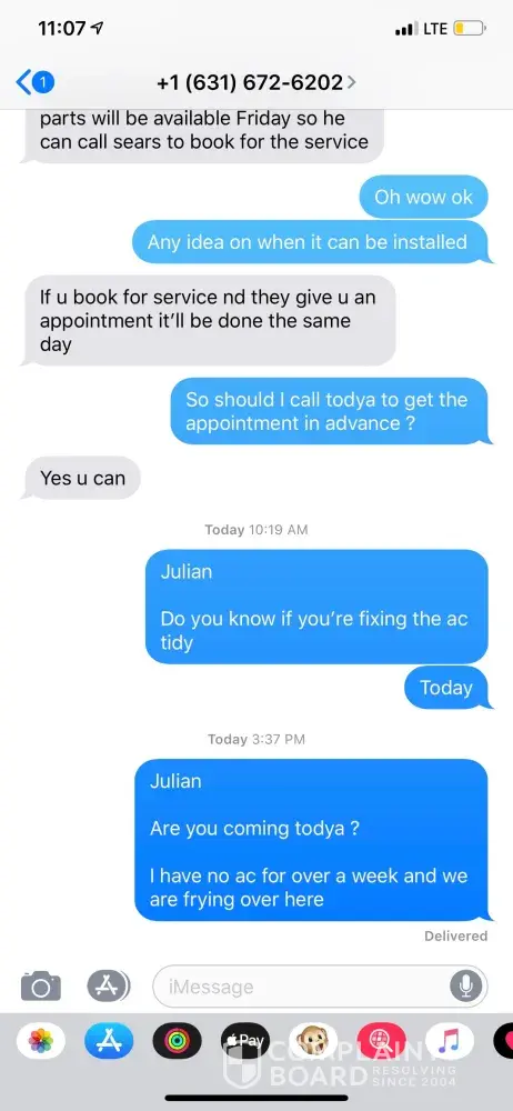 I had plans to leave on vacation tomorrow. So I called again. Very annoyed by this time, I called again. Spoke to a gentleman, I explained the situation, he says, well it's rescheduled for tomorrow isn't it? I said, yes, but I need to reschedule my flight, so I need an accurate time and can I be the first person seen? He says, sorry, I can't do anything about that, dispatch assigns the times and I can't call them only message them. I'm even more frustrated! I ask to speak to a supervisor. Same thing. It's like they were taught to say, I'm sorry, I don't know, dispatch takes care of that, etc. I'm missing my flight tomorrow for my vacation, my kids have been in a 95 degree home and no one seems to care. Very frustrated and upset.