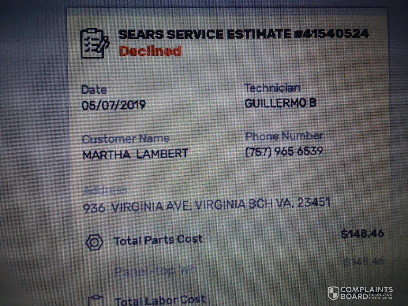 April 22, 2019. Technician came to assess/repair my dryer. He was pleasant and explained to me the issue — thermal fuse needed replacement. He did the replacement. Assessmt/repair took 20 mins total. Bill for service was $233.97! I was not provided with est. Cost before proceeding with the work so that I could decide whether to continue. I would never have agreed to this amount. I could have a neighbor replace this $10 part for free! I did not have a fair opportunity to make a decision — you state in your advertisement that technician is required to provide estimated cost to repair before making repair so I may decide. I was caught off-guard by this exhorbitant price for 20 mins work and a $10 (or less) part! I paid it but after reading your information that I should have had a chance to consider this huge cost before repair, I feel I am entitled to a refund of a good part of this huge cost I paid. What can you do to help me minimize this financial cost since I was not informed? James was personable but missed the most important step of telling me est cost ahead of time. Thank you for your consideration of my case. (district id: 8228) (tech id: 727446)