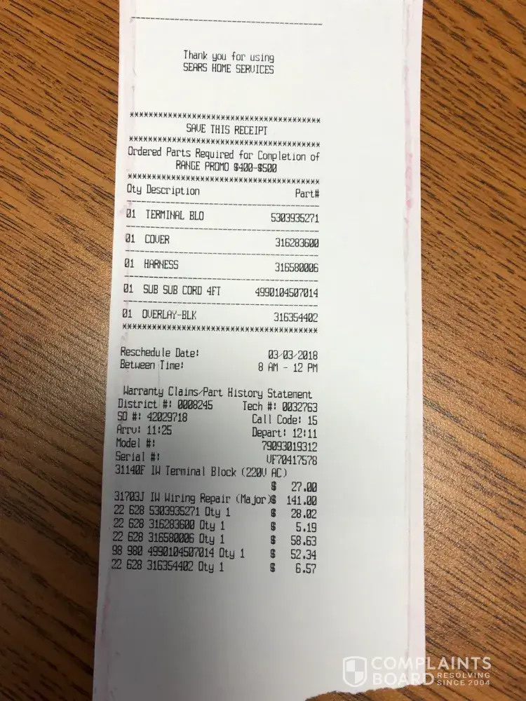 I called Sears the next day (2-15-18) to seek direction on the path to get a quick solution for a replacement and was told that a repair technician had to come out to confirm the issue first. This appointment was held on 2-16-18 and the technician confirmed the entire "guts" (wire harness, cable, control panel, etc.) was damaged and full replacement of parts was required. He further asked if Sears installed this electric range and I confirmed yes showing him the paperwork. His conclusion was the installer did not properly tighten down the neutral wires thus overtime caused the arcing that melted the cable to range and subsequent wiring harness and control panel to the oven. The total parts and labor far exceeds the value ($200 parts, $260 labor) of the new range I paid plus I'm very distrustful of the range fearing I'm putting my family and house at harms way of future incidents. The lead time of parts and availability of a technician out to 3/3/18 - total of 17 days! This was unacceptance and a complete inconvenience. I requested a new range and he indicated I need to work with the Sears Countryside store where I purchased it for a total replacement as he was not authorized. He fully understood my situation and in the spirit of customer service he went ahead and placed on order my parts while I worked with the local store for a complete replacement with a way shorter lead time and ease of mind.