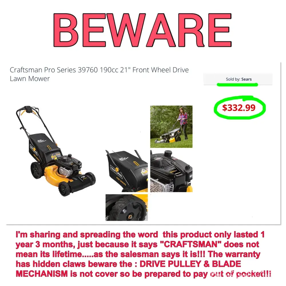 ✔ï¸BEWARE‼ï¸We purchased the craftsman pro front wheel drive lawnmower and this product only lasted 1 year 3 months upon taking to they're SEARS REPAIR SHOP as we were informed to take to. Waiting 2 weeks later for our lawnmower we were then told that the drive pulley and blade mechanism that holds the blade is not covered not to mention the salesman says craftsmans are good and lifetime. I have learned they will say anything for a sale! Liars no wonder they are closing some stores who needs a company that cant stand by their word! Last time we will ever buy a craftsman lawnmower from any SEARS STORE, better off with the cheaper brands that we have purchased and lasted longer than 5 years! Very dissatisfied and I am spreading the word! Its not worth the price so just want to share our experiences!