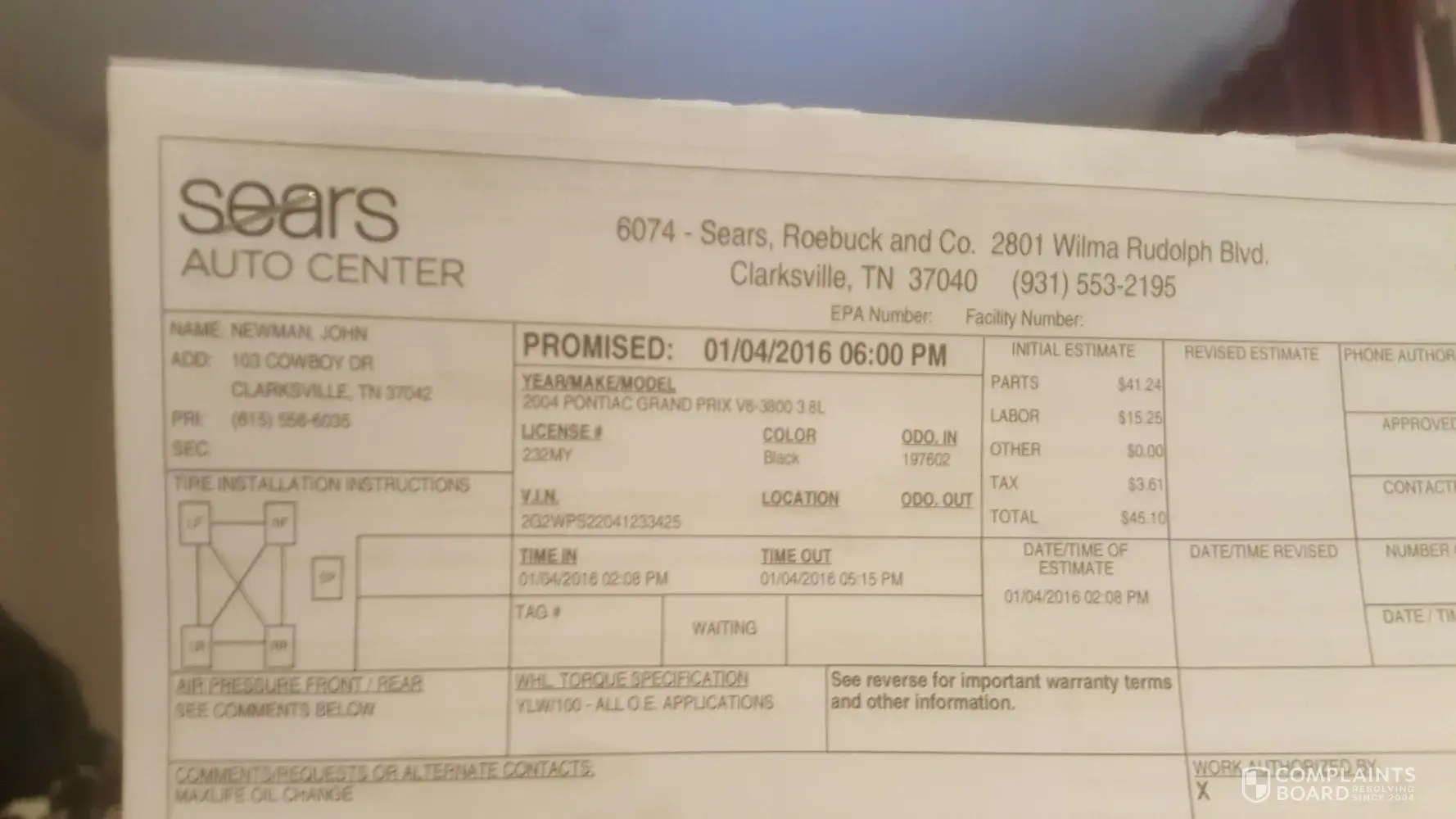 Went to sears auto in Clarksville, TN on monday for an oil change. went through the check in progress and agreed to have them text me when the car was ready. I asked how long the car would be. I was told 90 minutes but no more than 2 hours 15 minutes. at 208 pm i got the text asking me to respond with Y to get text messages from sears. 3 hours later...yes i said 3 hours later I told them I wanted to speak to a manager because I had been waiting 3 hours and my car still had not been taken into the garage. I was told there was NO MANAGER in the store. shortly after 5 pm they took my car in and completed the oil change. There was no offer to knock off some of the cost of the oil change because of the long wait. after I got home i got looking at the receipts. the one i signed when they checked me in said the car was promised at 4:15 pm. when i checked out THAT receipt was printed at 5:26 pm and at the top it said the car was promised at 6:00 pm. way to go sears changing the time on the receipt to make it look like you got my car done in a timely manner.
