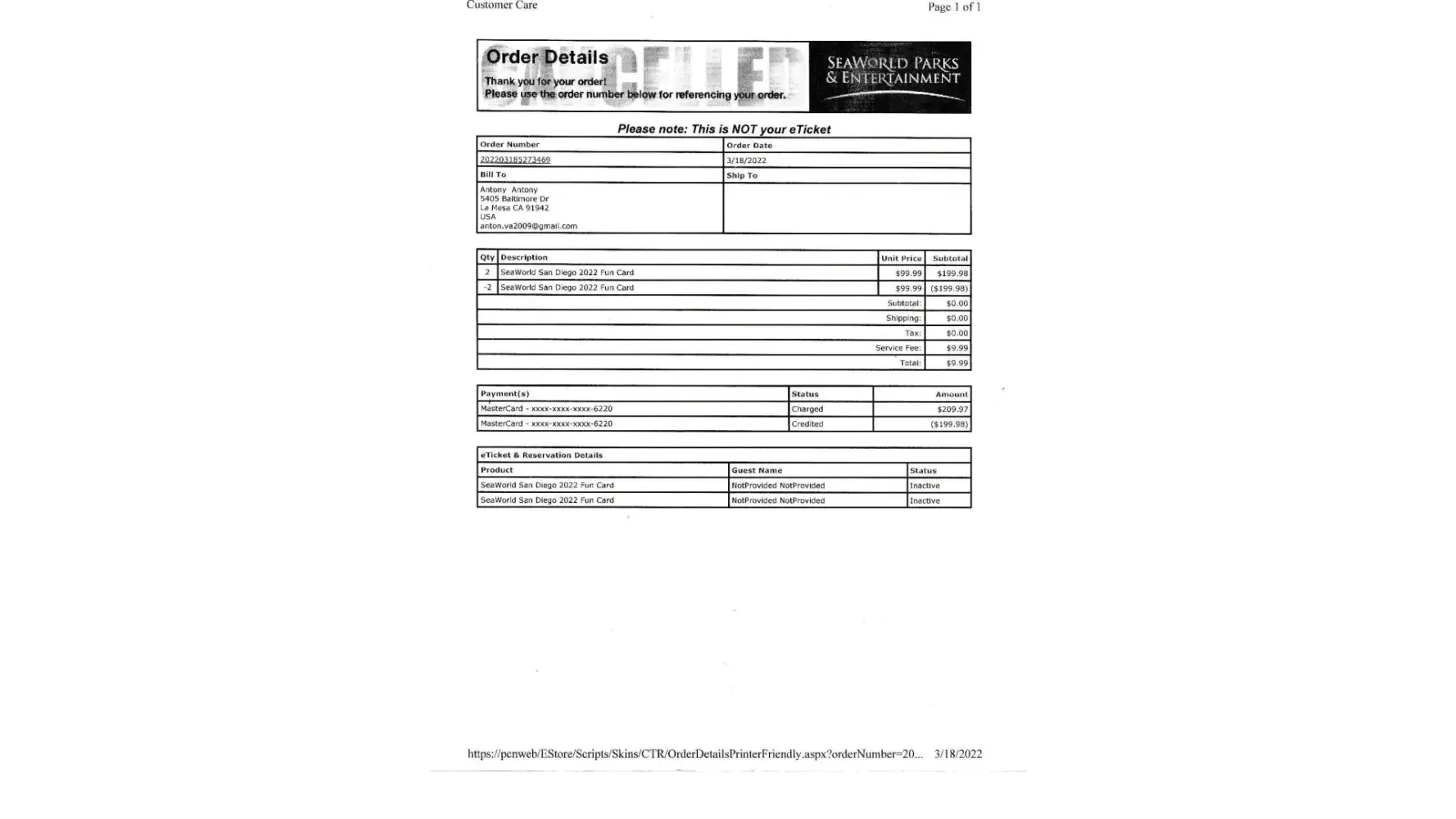 We requested for cancel ticket at gust service. They charged $238.14 and returned $227.32 on 3/22/2022. ($10.82 they took as service charge. I did not use that service, too?). Here is the attached receipt from seaworld.