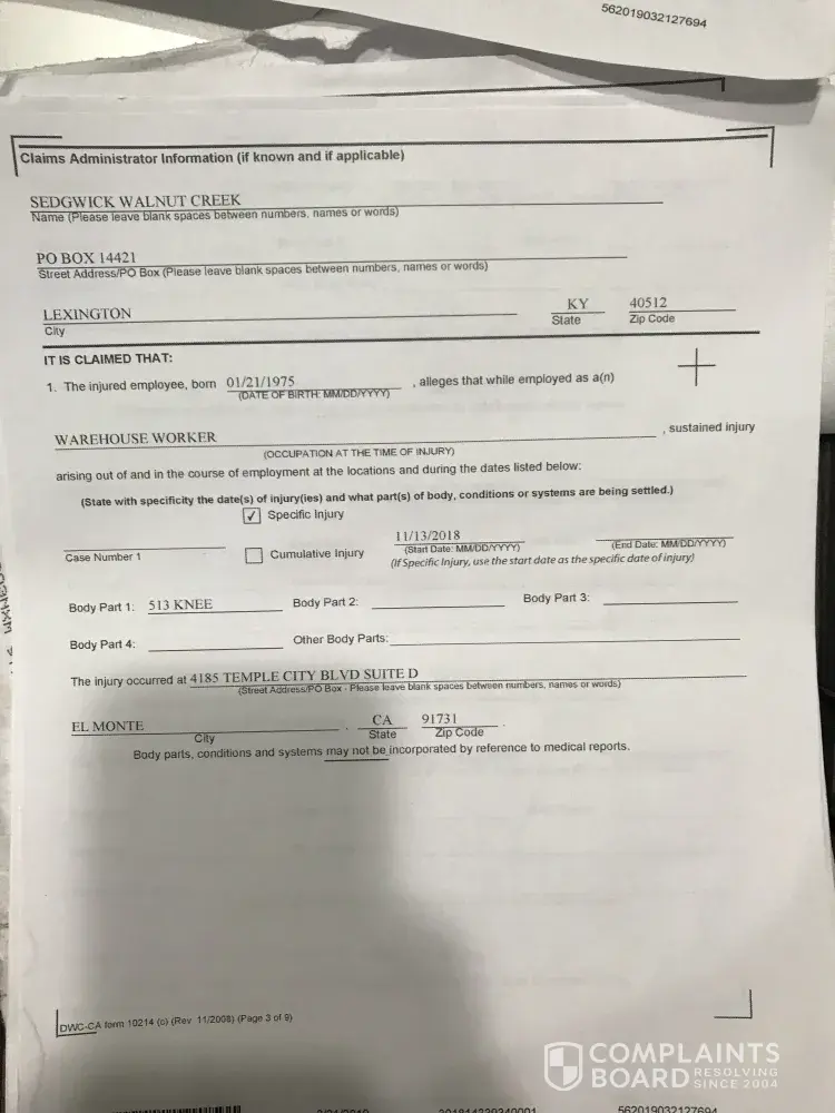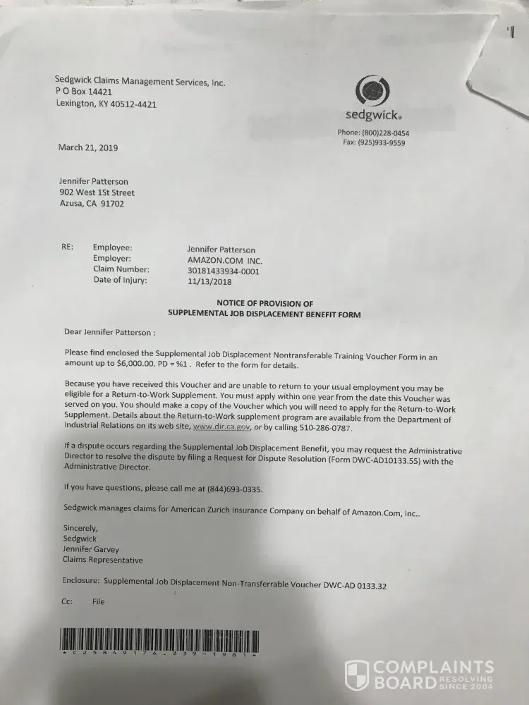 On April 03, 2019 I won my Settlement with Amazon and Amazon court ordered that a check for $8000 be sent to my residence on April 03, 2019. The check never arrived. So the check was cancelled on April 11, 2019 and re- issued. To be sent to my work at LA Fitness at 920 Freemont in Alhambra, Ca. I also made an account t on mysedgewick.com for my check to be directly deposited into my account on April 11, 2019; and Jennifer Garvey requested that the check be directly deposited on April 11, 2019. The check was not directly deposited. The check was re-issues on April 23, 2019; which Jennifer Garvey told me over the phone on April 23, 2019; plus she sent me an email verifying this on my gmail.co
