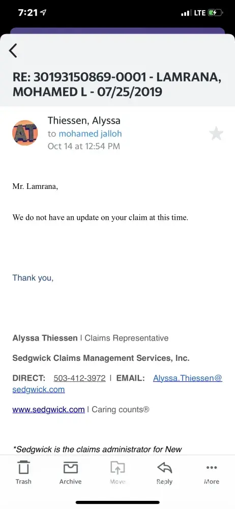 Last time, I asked to advise and information of visit the doctor or not that was invited by sedgwick. They said is covered, but it is not later on receiving a bill. A lot of people did much better than them. This is a waste and delay of time. They just open the arms and later is wrong and you pay the bill? I don't think so. I think if you make wrong instruction and advise. Depend on the incident lost. YOU go to jail. They are very careless. And always waste people money for not listening well enough of people/or adult questions? During his /her job duties. They just pretend peace like a kid and get pay check.