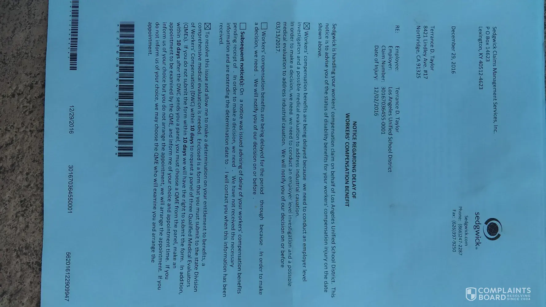 Too whom it may concern..My name Terrance Taylor an I have an Claim with your company.I been off work since 12-08-2016 without any money coming in my rent is due car payment are coming soon...I need food for me an my sin too eat but with any money for my workman's comp where straving...My claim red is Veronica Gutierrez.She isn't working hard enough too get my Claim off delay.I've sent everything that was asked of me to your company...I have talk too Veronica as well as her supervisor the situation an they have done nothing for me far as getting my money started...I need Help too pay my bill...LAUSD doesn't give me vacation nor illness time...Broke