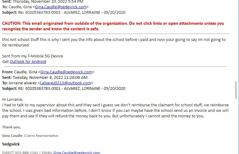So I was provided with what you call request for reimbursment of expenses supplemental job displacement forms so gina caudle who is currently my adjuster I was told that which ever I decided to do with it the expenses would be reimbursed if I provided receipts ok so I was reimbursed for my laptop so before I used my money for school I provided her with school info etc. She told me and I have proof that go ahead and pay out of pocket and she would send me back my money which was $4000.00 so I did after I send her the proof of completion she tells me sorry I cant send you the money I explained to her why if I did what she asked me to do I told how was that ok she told me well I dont know what to tell you tell them to give you your money back I was shocked and lost for words I told her that I beleive that she should explain to her boss that she made a mistake and provided me with wrong information I need my money back how am I supposed to ask for my money back thats absurd I then told her I would speak to my lawyer she said then go talk to your lawyer
