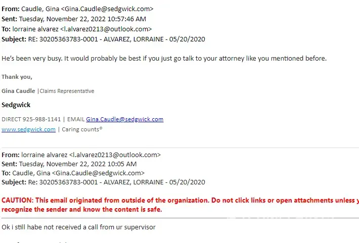 My claims examiner Marilyn Mack had been unresponsive to my questions. She contradicts herself thru email and will not take my phone calls so we can discuss my case and my concerns. I am being paid but my providers are getting very rude responses from her. I was contacted by One Call Care Management which is a vendor of Sedgwick. They set up my PT appointments and after 2 appointments Sedgwick denied payment to the PT by saying I could not set up the appointments myself. I explained to Marilyn that if was her company/vendor that set up the appointments. She continued to say my PT was not in network. I have been leaving phone messaged for her that are never returned and emails are short and vague and does not address my issue