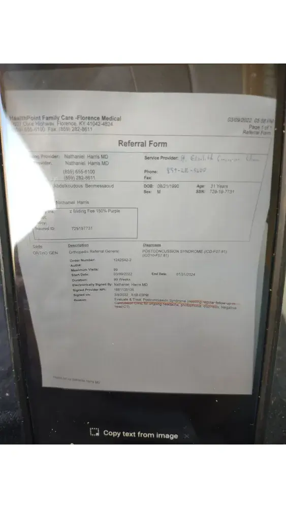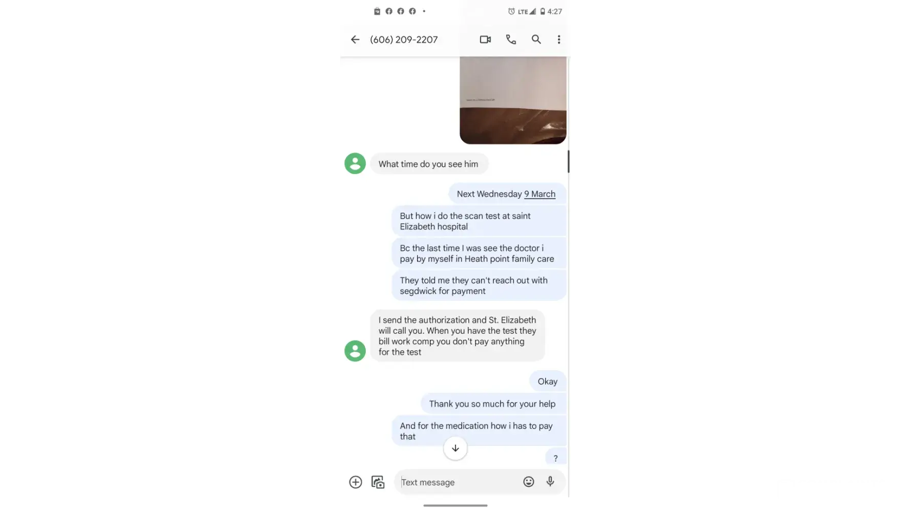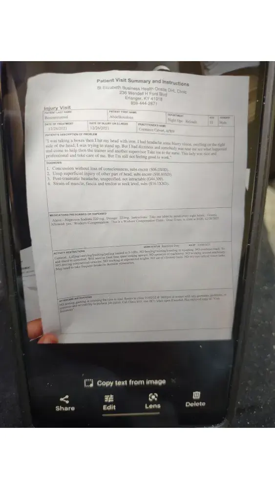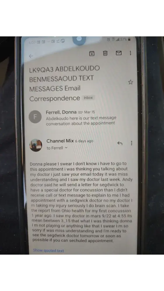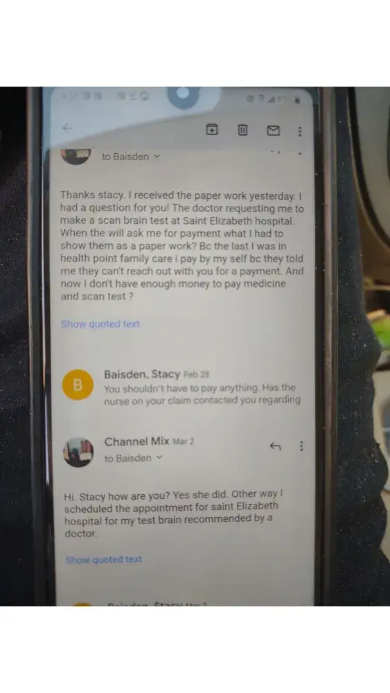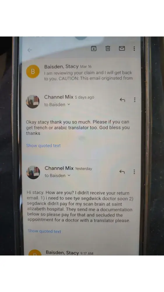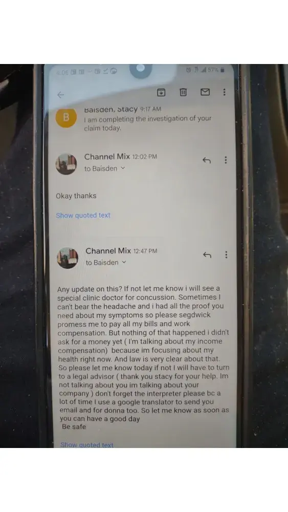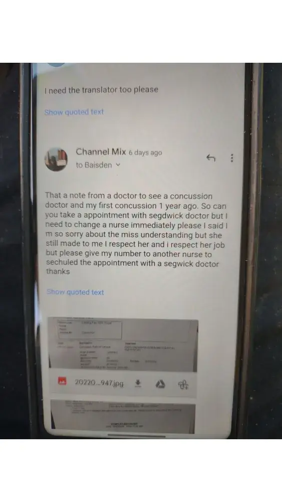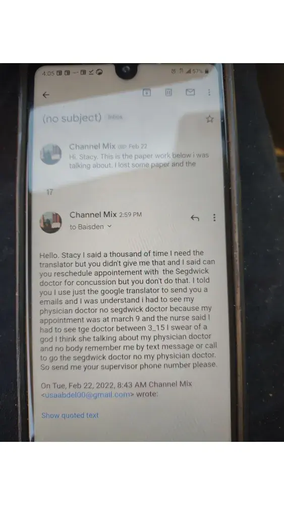 Hi. I had injury at work in December 23/2021. I was talking with a nurse and explained to her that my English is no good and i need the translator so she was asking me about my physician doctor appointment than she told me you have to see a doctor between March 3_15 i was thinking she talked about my physician doctor no segdwick doctor because i had a appointment with a doctor in March 9 and i didn't know she talked about a segdwick doctor so i apologize for my miss understanding and i said can you reschedule a segdwick doctor appointment soon even tomorrow i can come but she was rude and she refused she text me in March 15 and she said i sent you a email but i didn't know that since March 15 because i didn't receive any call or text me message notifie me i had a appointment with a segdwick doctor talking with the adjuster Stacy denied my claim you can found all the proof below. Other way they told me you don't have to pay nothing for your brain test at saint Elizabeth hospital they already take care of that but yesterday i was receiving a letter from the hospital to pay a bills they was liars to me that really illegal and unprofessional so please 🙏🙏 please can you fix this issue for me i need just the insurance cover my spending for visiting doctor and medication and the days i wasn't working thank you for help have a good night