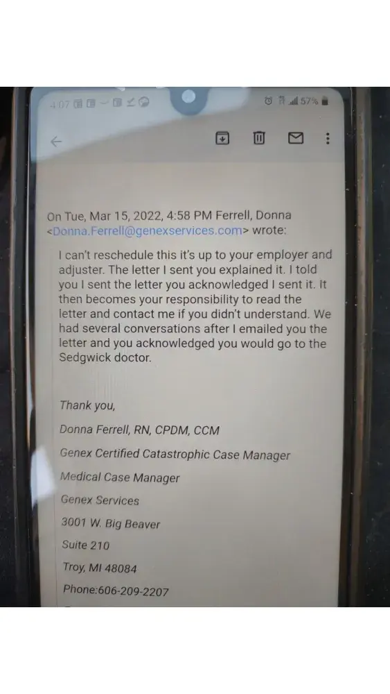 I do want to make you aware of how bad she has mishandled my case. I only told you of one test. I did have a surgery but it took her six months to approve and for that has probably left me with an issue to my kidney, I only have one as she knows. My store my manager did ask me in a text if I was seeking to file a claim against your company Sedgwick for the mishandling of my case. I ask you if your own client thinks seeking damages against your company would be appropriate then you might ask yourself might I not check out my clerk/ claims mgr.. I found they my employer had know qualms in me filing a suit against your company, therefore I have hired one of the top 25 SUPER LAWYERS in my area.