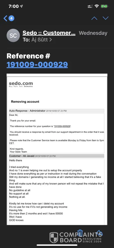 Then there was no reply from your end about a week later I tried to logged in my account and wot I found out that my account is simply removed from sedo without any intimation or any confirmation anything just noting at all,