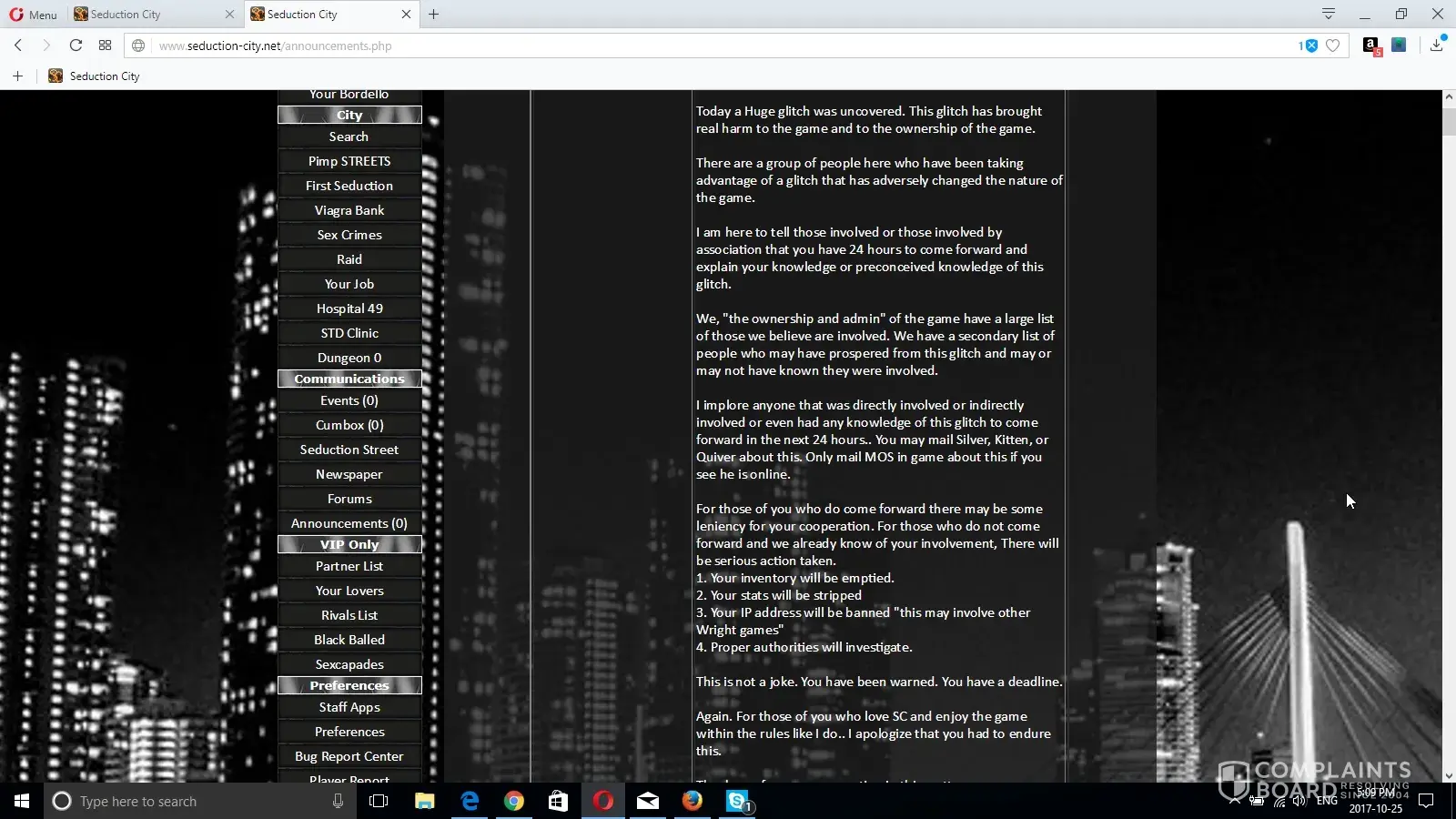 My friend advised me to visit the website www. Seduction - city. Net. He told me that he played the game here really often and he liked it. I went and registered on the website. But after several weeks, my account was blocked and i couldn’t access to it. It turned out that the moderators and the owner needed only money, and if you didn’t pay for the services and didn’t buy, you would be blocked. I was shocked with such policy and decided to warn everyone about it. Share this info.