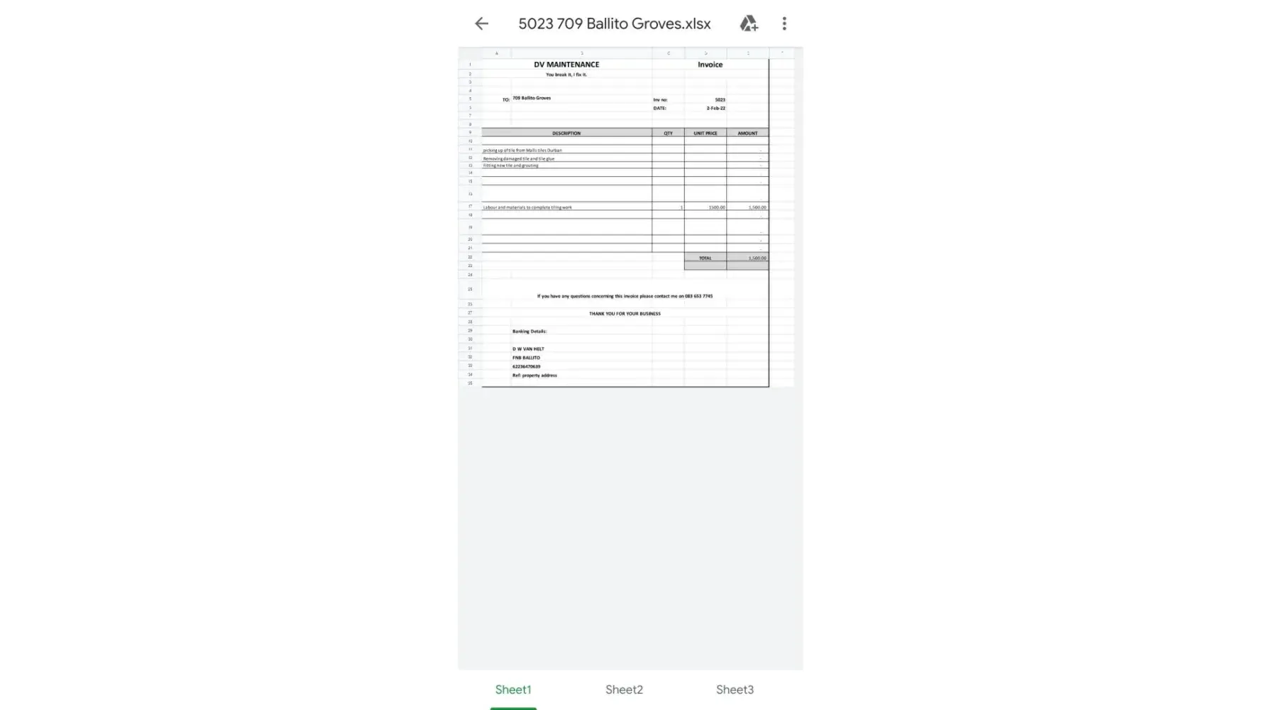 I was after a month sent an invoice from an excel spreadsheet with a straight amount of R1500 not obtaining any other info of labour or even a company letterhead or stamp which i find really unprofessional and sketchy. As i was expecting the 3 quotes which could not be provided and then a straight amount of R1500